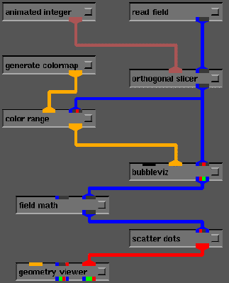 On the left side you can see the network we used to visualise the data, on the right side is one of the frames produced by the AVS-Network and the field description: